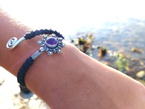 צמיד בראס יוניסקס מתאים ליד לאישה או לגבר אבן אמטיסט סגולה (אחלמה), חוט שחור . עיצוב ספירלה