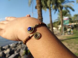 צמיד בראס יוניסקס מתאים ליד לאישה או לגבר אבן לאפיס כחולה, חוט חום . עיצוב ספירלה