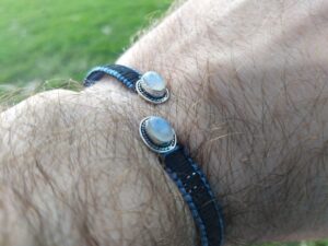 צמיד בראס יוניסקס מתאים ליד לאישה או לגבר אבני מון סטון (אבן הירח ), חוט שחור כחול
