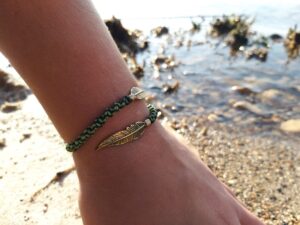 צמיד בראס יוניסקס מתאים ליד לאישה או לגבר עיצוב 2 נוצות בצבעי מיקס ירוק ושחור